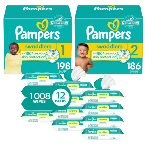 بامبرز مجموعة حفاضات ومناديل مبللة للاطفال، قماط للاستعمال مرة واحدة، مقاسات 1 (198 قطعة) و2 (186 قطعة) مع عبوة مائية حساسة، عبوة متعددة قابلة لاعادة التعبئة (1008 قطعة)